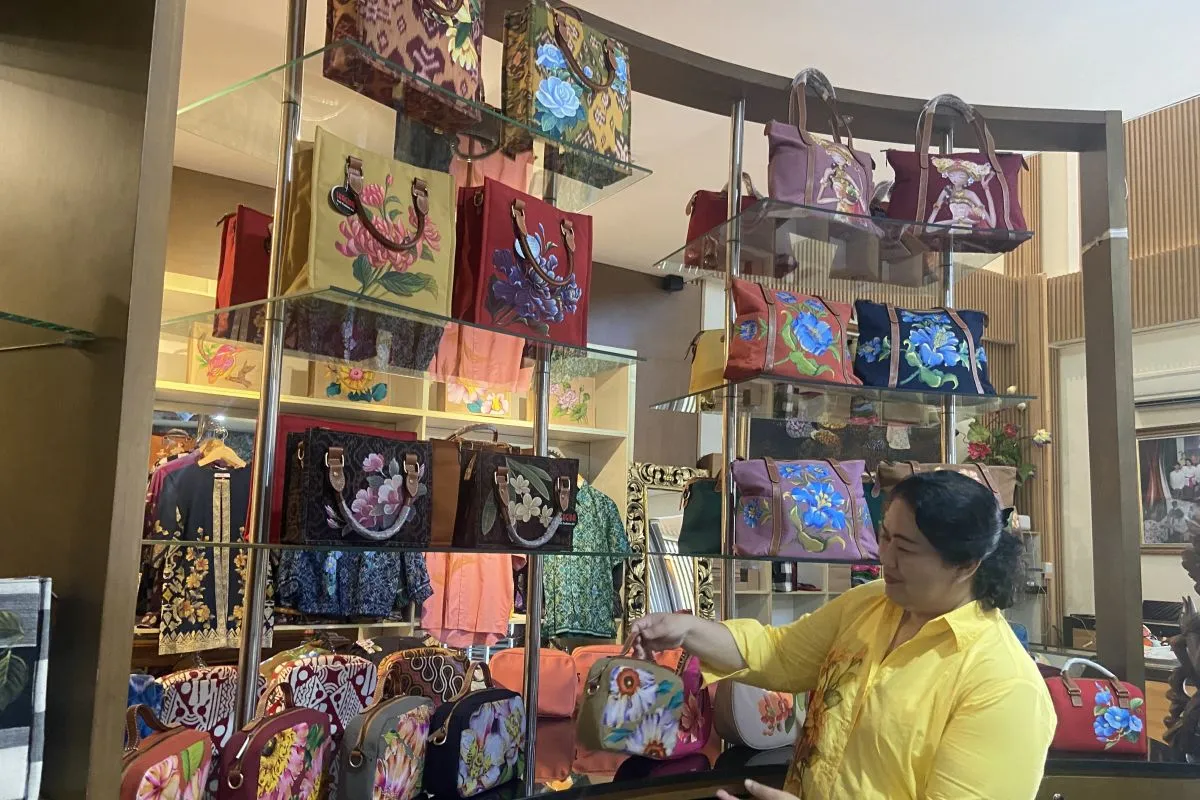Di pusat Kota Denpasar, seorang perempuan memasarkan produk tas lukis buatan warga lokal yang memadukan kekayaan seni Bali dengan kebutuhan wisatawan untuk oleh-oleh.