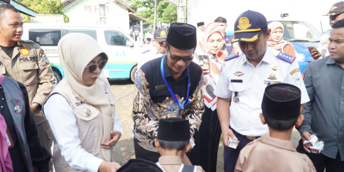 PANDEGLANG,ukara.id – Bupati Pandeglang Raden Dewi Setiani membagikan susu kotak kepada ratusan anak sekolah di Pondok Pesantren Hidayatul Mubtadi’ien Desa Sobang, Kecamatan Sobang, Kabupaten Pandeglang pada jumat (18/07).